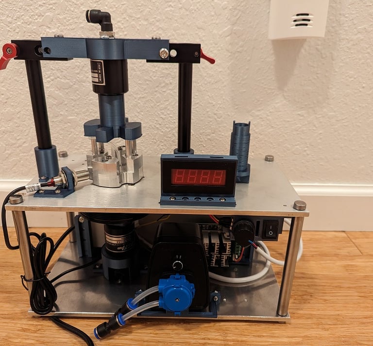 The centrifuge allows fluid to pass the swivel valves while it is turning. It was design to separate the micro-plastic particles from the water samples from the environment to evaluate the pollution level. It can mount any testing chamber disk up to 5" in diameter and 0.25" in thick. The main features are
